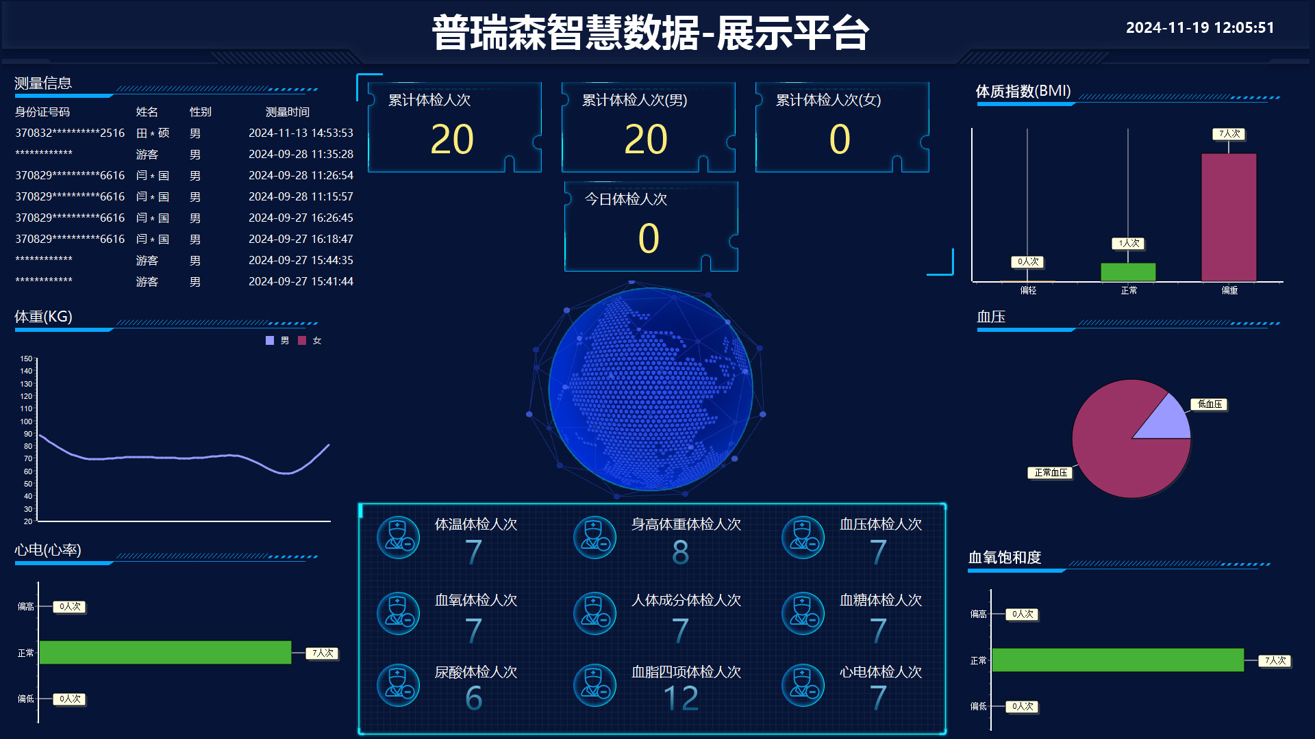 平臺包括多個模塊,提供詳細的體檢人次統計、個體測量數據、以及健康狀況的可視化分析,幫助個人和企業全面掌握體檢動態、健康趨勢與風險預警